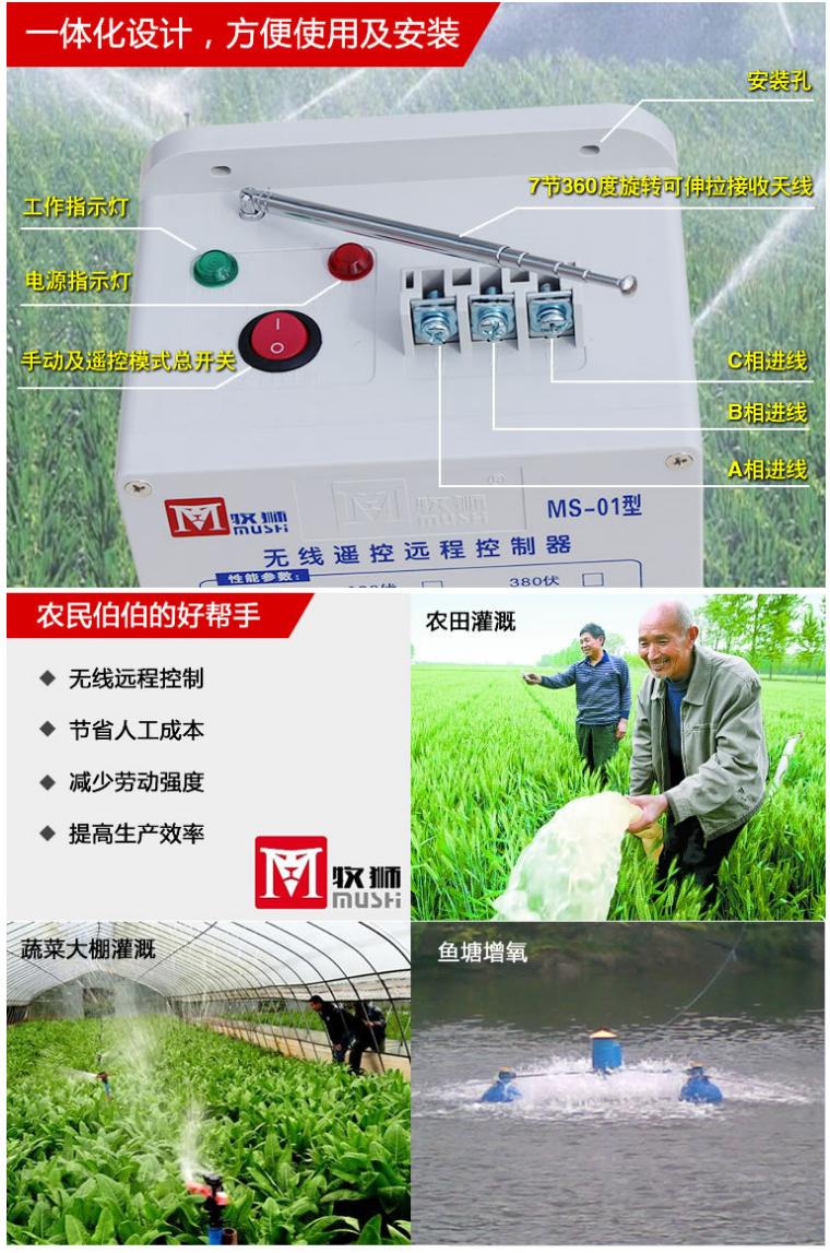 加长可转向天线,接收性能更强,距离更远!空旷地带遥控距离可达500米! 本套新款三相电机无线控制器,采用的交流接触器额定电流为25A,可以控制轻载7.5KW,一般负载5.5KW及以下功率的各种电动机:如风机、水泵、空压机、机床电机、液压泵电机、增氧机电动机等各种电动机的开停操作!带电动机过载、缺项保护功能。 三相线进,三相线出,外置式接线端子,一目了然,非常方便!