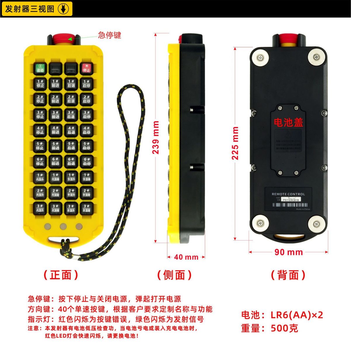 RJ-A40S型工业遥控器适用于40个及以下控制点数的工业设备无线控制,按键功能可以设定为点动(按住继电器闭合,松手断开)、自锁(按一下按键,对应继电器闭合,再按一次断开)、开关功能(两个按键控制一个继电器,第一个按键按一下,继电器闭合,第二个按键按一下继电器断开)。也可以实现多键的复合逻辑功能。如一二三四五档切换等。